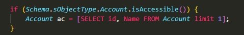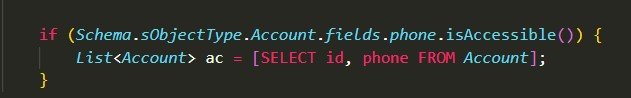 - Schema.sObjectType.Account.isAccessible() – before querying