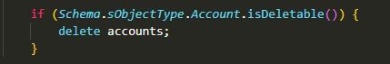 - Schema.sObjectType.Account.isDeletable() – before deleting