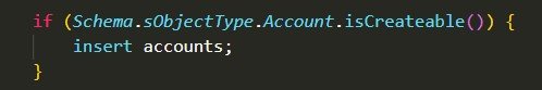 - Schema.sObjectType.Account.isCreateable() – before inserting