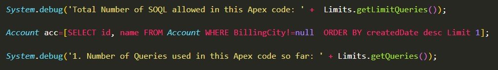 Now, using the above Limit methods we can check how many SOQL queries we can issue in the current Apex Context
